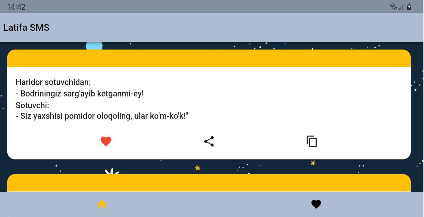 Ushbu لطيفة SMS sizga qiziqarli latifalarni taqdim etadi. Siz ushbu latifalarni o'qishingiz mumkin، do'stlaringiz bilan ulashishingiz mumkin va sizga yoqib qolgan latifalani saqlab quyishingiz mumkin.