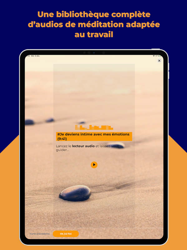 > مكتبة تضم العشرات من ملفات التأمل الصوتية الموجهة، والتي يمكن للجميع الوصول إليها لبدء التأمل في أي مكان وفي أي وقت أو تعميق ممارستك وفقًا لاحتياجاتك: تقليل التوتر، واكتساب الثقة، والرفاهية، والشعور بمزيد من المشاعر الممتعة، والعثور على الهدوء الداخلي... من 3 دقائق إلى 15 دقيقة، اختر مدة التأمل التي تناسبك.