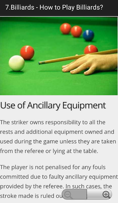 Billiards is a game that can be compared to the game of carom. In this game cue is used as a striker and balls are to be put into the pockets. This Learn Billiards App lets you know about the game, its rules, and the method of playing.