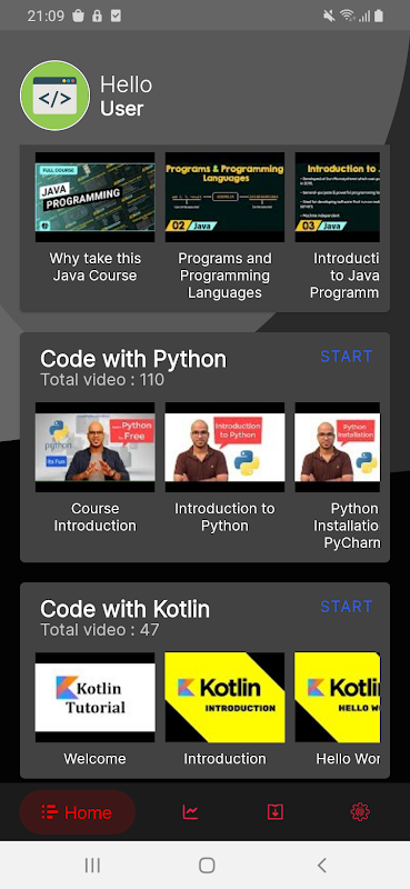 Learn code is an application that teaches you from basic to advanced: C, C ++, Java, Python, Kotlin