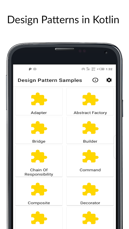 يوفر تطبيق عينات التصميم عينات رمز نمط التصميم المكتوبة في Kotlin وأوصافها.