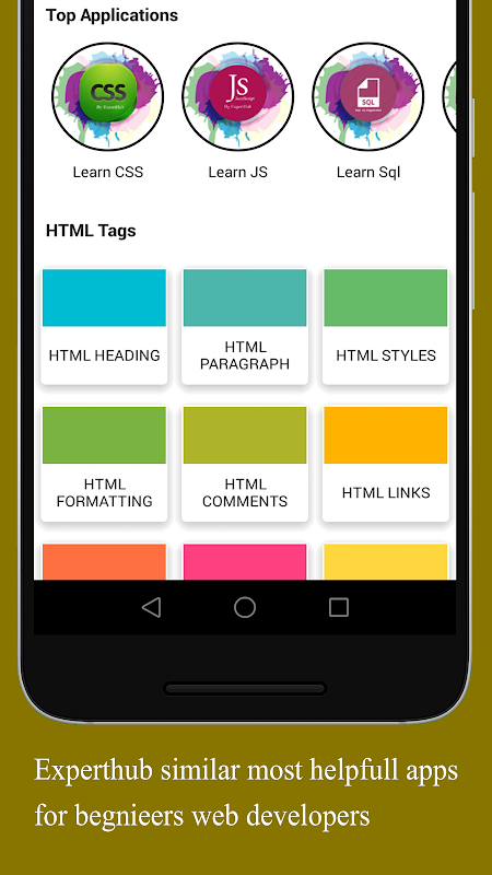 You can easily understand the html code tag with great interface and html code guide for beginners. After that you will easily understand the development of html. This app also covers the html5 advanced tag with brief description.