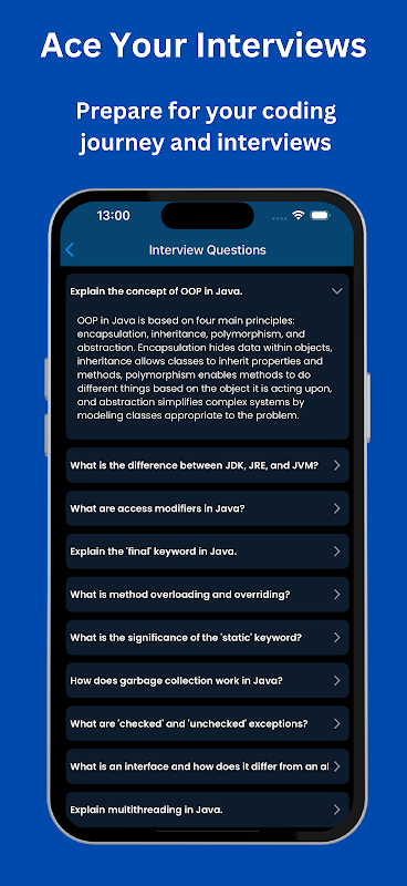 باستخدام مترجم Java المتكامل، تتيح لك Java Academy تشغيل التعليمات البرمجية الخاصة بك على الفور ورؤية المخرجات. اختبر التعليمات البرمجية الخاصة بك على الفور، وافهم كيفية عملها، وقم بتجربة التغييرات لمعرفة تأثيراتها في الوقت الفعلي، كل ذلك ضمن برنامج Java Compiler المدمج في التطبيق لتوفير الراحة القصوى.
