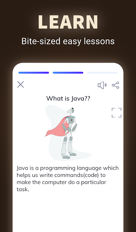 مع تطبيق "Learn Java Programming" ، يمكنك جعل تعلم الكود سهل وممتع. فيما يلي الميزات التي تجعلنا خيارك الوحيد لتعلم لغة برمجة Java -