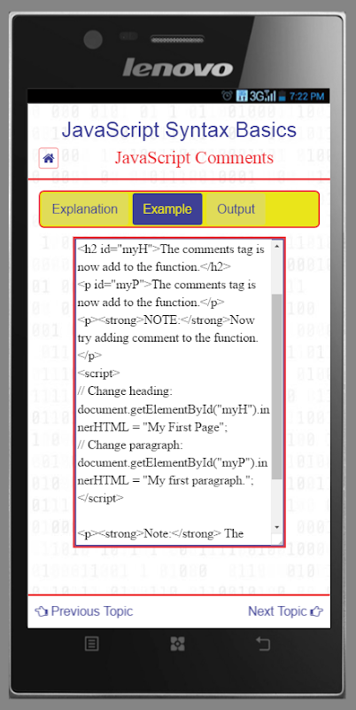 جافا سكريبت هي واحدة من لغات البرمجة الأكثر أهمية اليوم. الآن تعلم جافا سكريبت لوحدك في منزلك، وهذا ايضا من دون الإنترنت. تم تصميم التطبيق ليعلمك الجافا سكربت في أبسط طريقة، مع شرح أيضا أمثلة لفهم أفضل. يمكنك أيضا الحصول على أمثلة مع وضع محرر بحيث يمكنك تحرير التعليمات البرمجية وفقا لمتطلباتكم ويظهر الإخراج على الفور.