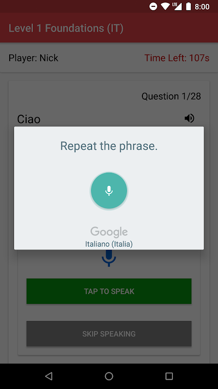 The app uses advanced speech recognition technology to help improve your pronunciation as you learn new words. Every word or phrase is also spoken aloud and has a matching image so you can hear, speak and see what you're learning.