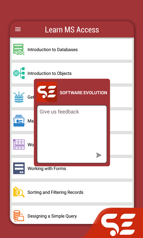 In this application, you can learn some basic and advanced features in MS Access with simple step-by-step tutorials to guide you along.