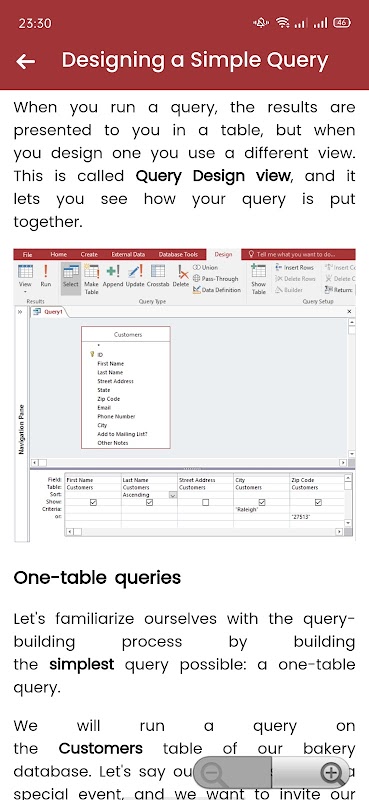 يقدم لك برنامج Learn MS Access دروسًا مفصلة للغاية ، وفيما يلي محتويات وميزات التطبيق: