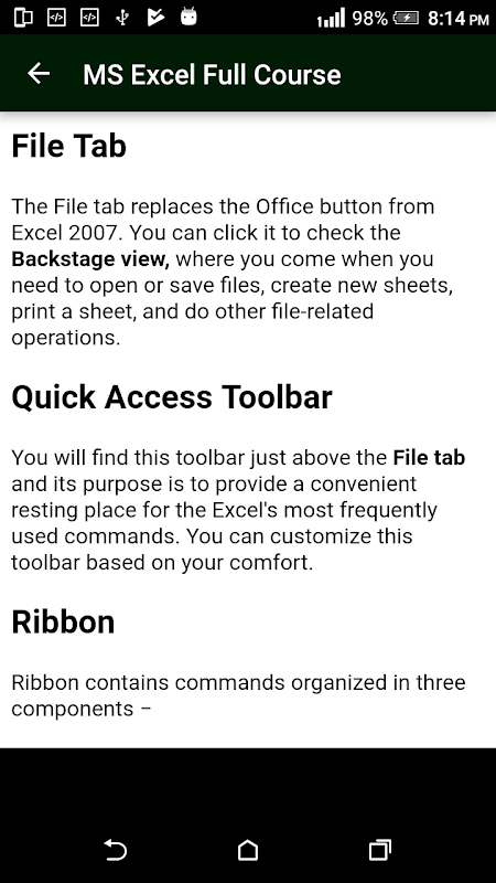 دورة كاملة في برنامج MS Excel - التعلم الكامل لبرنامج Microsoft Excel. تصميم سهل الاستخدام وتطبيق غير متصل بالإنترنت. يمكن لأي مستخدم الوصول إلى التطبيق من أي مكان وفي أي وقت بدون الإنترنت.