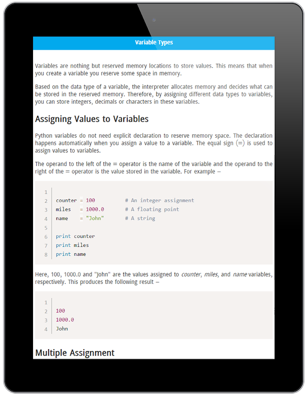 From this app, you will able to learn basic Python Programming. We are updating content regularly. Enjoy.