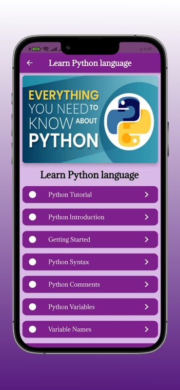 باستخدام تطبيق Learn Python للغة ، يمكنك العثور على دروس دورة تحليل البيانات ودروس البرمجة والبرامج والأسئلة والإجابات وكل ما تحتاجه إما لتعلم أساسيات لغة Python أو لتصبح خبيرًا في برمجة دورة لغة Python.
