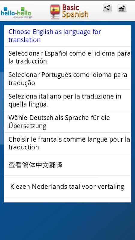 ميزات التطبيق الاسبانية مرحبا، مرحبا في: