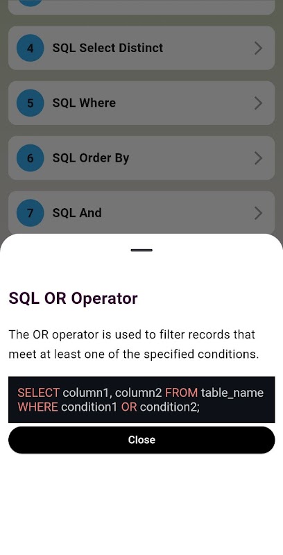 بالإضافة إلى قسم التعلم، يتضمن التطبيق ورقة معلومات SQL قوية توفر إجابات سريعة وموجزة مع الأمثلة. سواء كنت بحاجة إلى مساعدة في كتابة استعلام أو تحديث البيانات أو التعامل مع المعاملات، فإن ورقة الغش الخاصة بنا توفر لك تفسيرات وأمثلة سهلة الفهم، مما يوفر لك الوقت ويساعدك على حل المشكلات بشكل أسرع.