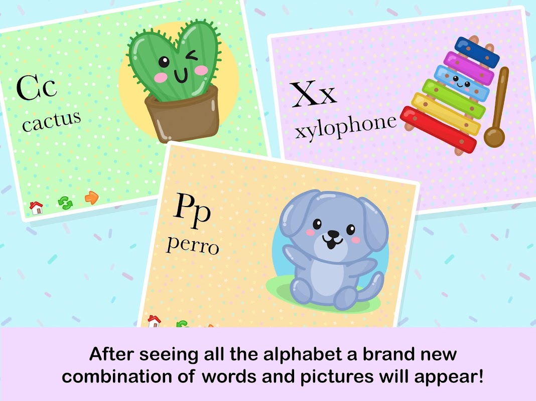 Generates a set of words and cute pictures to learn all the alphabet. After seeing and listening to a set, kids can see a brand new combination of words and pictures!