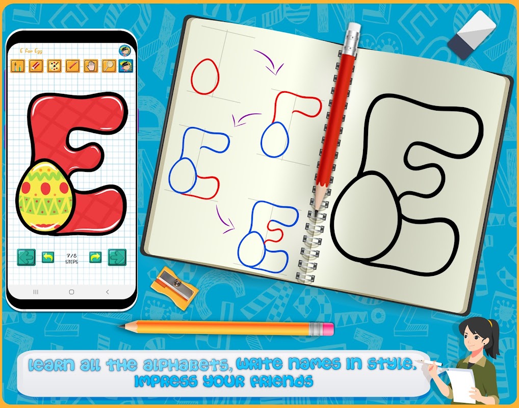 Learn How to Draw ABC هو تطبيق غير متصل بالإنترنت يوفر بيئة للرسم والتلوين للأشخاص من جميع الأعمار الذين يرغبون في الكتابة باستخدام الحروف الهجائية الأنيقة الملونة. يأتي التطبيق مع إعداد جاهز للرسم. يمكنك إنشاء رسومات أبجدية لطيفة مباشرة على شاشة هاتفك باستخدام الأدوات الموجودة داخل التطبيق (Pencil ، Eraser ، Color Pallets. إلخ). يوفر تطبيق Draw Cute ABC أيضًا ميزة Zoom-in حتى تتمكن من إنشاء رسم مثالي مع كل التفاصيل الصغيرة. هناك أيضًا ميزة التراجع عن الإعادة حتى لا تضطر إلى البدء من جديد إذا ارتكبت أي خطأ. ما عليك سوى النقر على زر "تراجع" وسيقوم بمحو آخر سطر مرسوم. يمكنك كتابة أسماء رائعة باستخدام الحروف الهجائية المرسومة ومشاركتها مع أصدقائك على تطبيقات الوسائط الاجتماعية مباشرة من هاتفك.