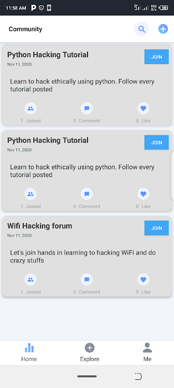هذا هو تطبيق مجتمع القرصنة الأخلاقي للمساعدة وليس لسوء الاستخدام. يمكنك الدردشة مع الأعضاء الآخرين بسهولة عن طريق إنشاء منتدى للمناقشة قد يكون للبرامج التعليمية والمساعدة والأدلة.