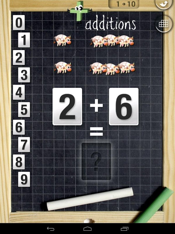 وسوف الاطفال 4-10 تكون هناك اضافات متعة التعلم، الطرح، الضرب والانقسامات الجداول (إلى 10) مع هذه اللعبة.