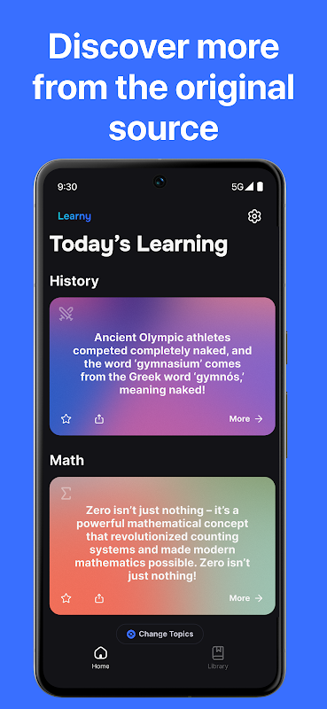 مع Learny، التعلم المصغر متاح في أي وقت. انغمس في موجز التعلم المصغر اليومي، حيث نُختار كل حقيقة بعناية لإلهامك وتثقيفك. تضمن لك ميزة "حقيقة اليوم" أن تبدأ كل صباح بمعلومات جديدة تُثري فضولك طوال اليوم.