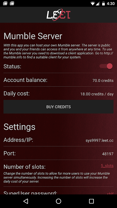 Note: You control your Mumble server using this Android app, but the actual Mumble server is hosted on a server that runs "in the cloud" and is accessible 24/7.
