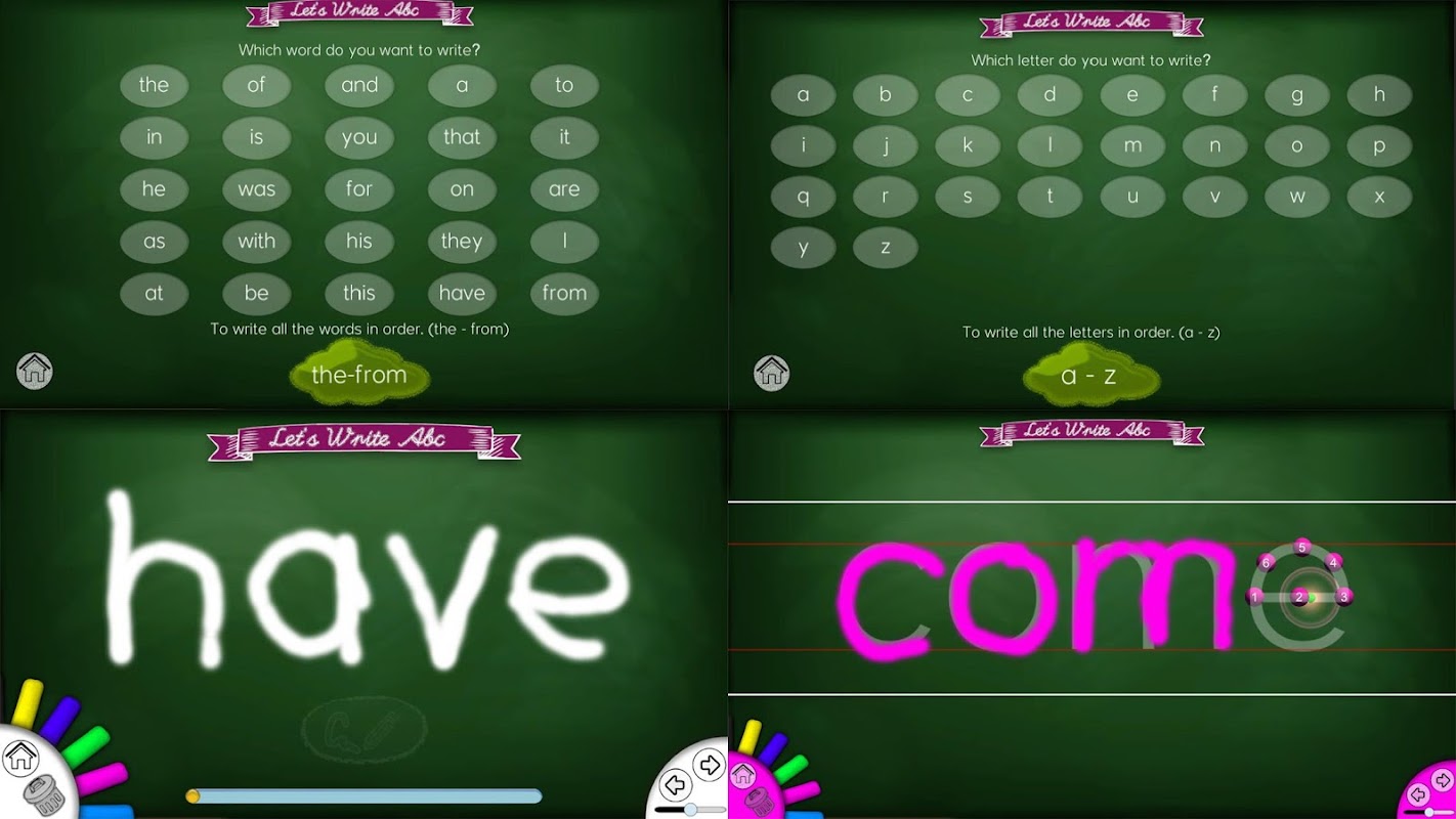So, it strengthens the correspondence of numbers, letters and words with these animations and encourages to write attentively.