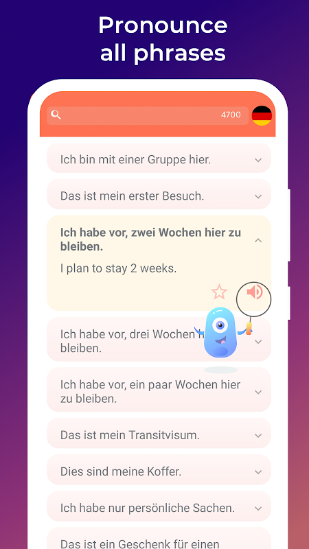 Learn German contains over 4700 commonly used German phrases and vocabularies for travelers and beginners in 15 categories: