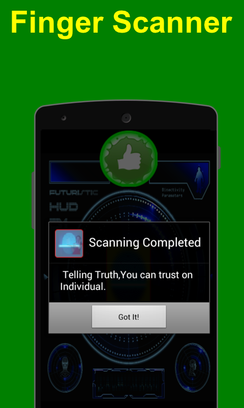 Disclaimer-This is not any real Lie detractor(polygraph) or not any real finger scanner,It just a prank application which show its scanning output on the Random basis