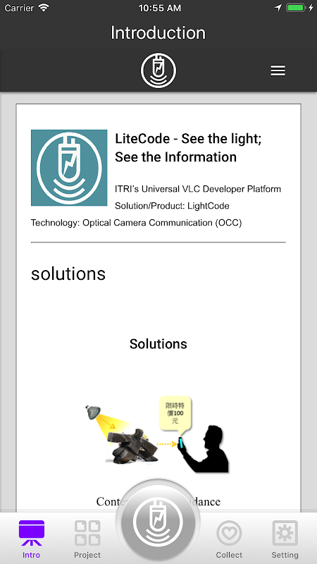 -本app採用工研院開發之光碼(Light Code)技術,使用者可透過自身的行動裝置掃描含有光碼的海報燈,燈箱,或是螢幕即可下載相關參考資料
