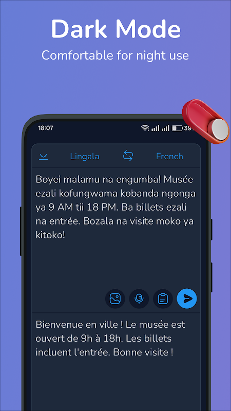 - التعرف على الكلام بشكل طبيعي: ما عليك سوى التحدث بشكل طبيعي والحصول على ترجمات مثالية إلى الفرنسية أو اللينغالا