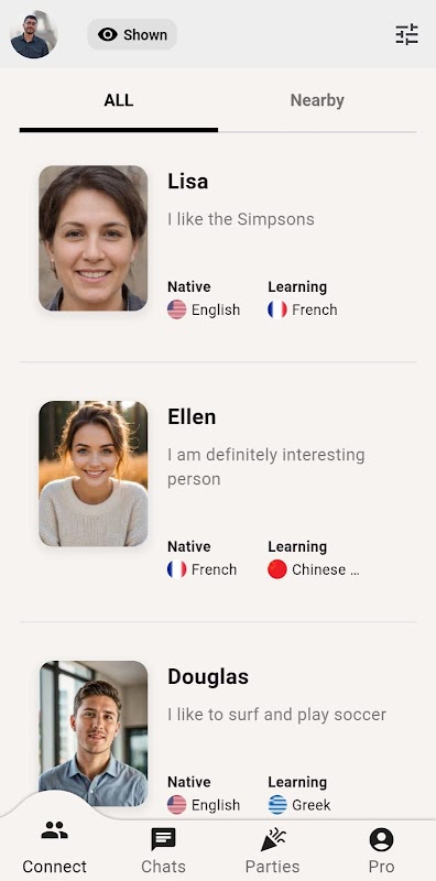 تتيح لك LinguaLinks تحديد كيفية الاتصال ومع من. سواء كنت ترغب في استكشاف الثقافات، أو ممارسة اللغات، أو تكوين صداقات، فأنت دائمًا المسيطر.