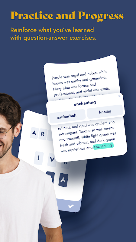 اختبارات الاختيار من متعدد: اختبر مهاراتك في الفهم والقواعد من خلال اختبارات الاختيار من متعدد. تدرب على إجادتك للغة وتتبع تقدمك كلما تقدمت في مستويات مختلفة.