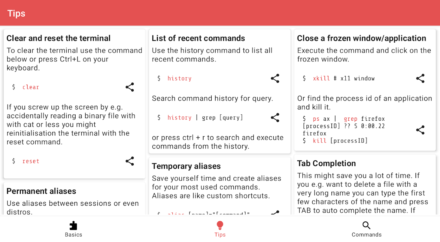 يحتوي التطبيق حاليًا على 7700 صفحة دليل، و23 فئة أساسية، بالإضافة إلى مجموعة من النصائح العامة لاستخدام سطر الأوامر. يعمل التطبيق بشكل كامل دون اتصال بالإنترنت، ولا يتطلب اتصالاً بالإنترنت، كما أنه لا يحتوي على أي برامج تتبع.