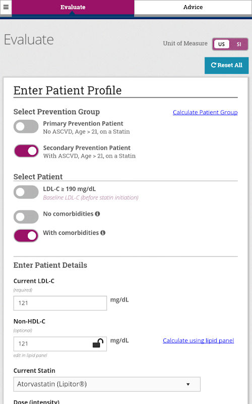 - أداة تقدير مخاطر ASCVD: لحساب خطر الإصابة بفرط كوليسترول الدم الشرياني المزمن قبل العلاج، وتحديد مدى ملاءمة علاج الستاتين للمريض.