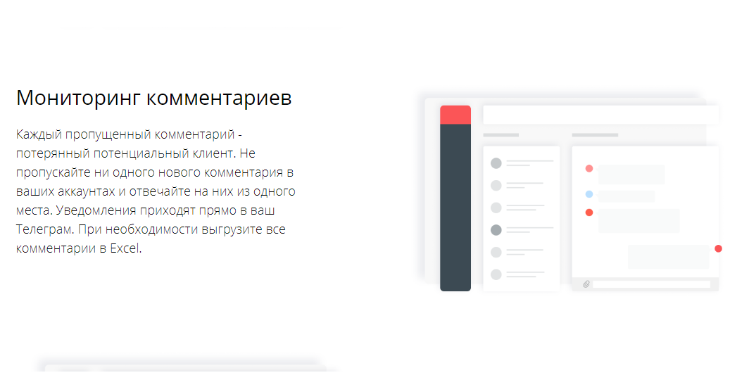 Каждый пропущенный комментарий - потерянный потенциальный клиент. Не пропускайте ни одного нового комментария в ваших аккаунтах и отвечайте на них из одного места. Уведомления приходят прямо в ваш Телеграм. При необходимости выгрузите все комментарии в Excel.