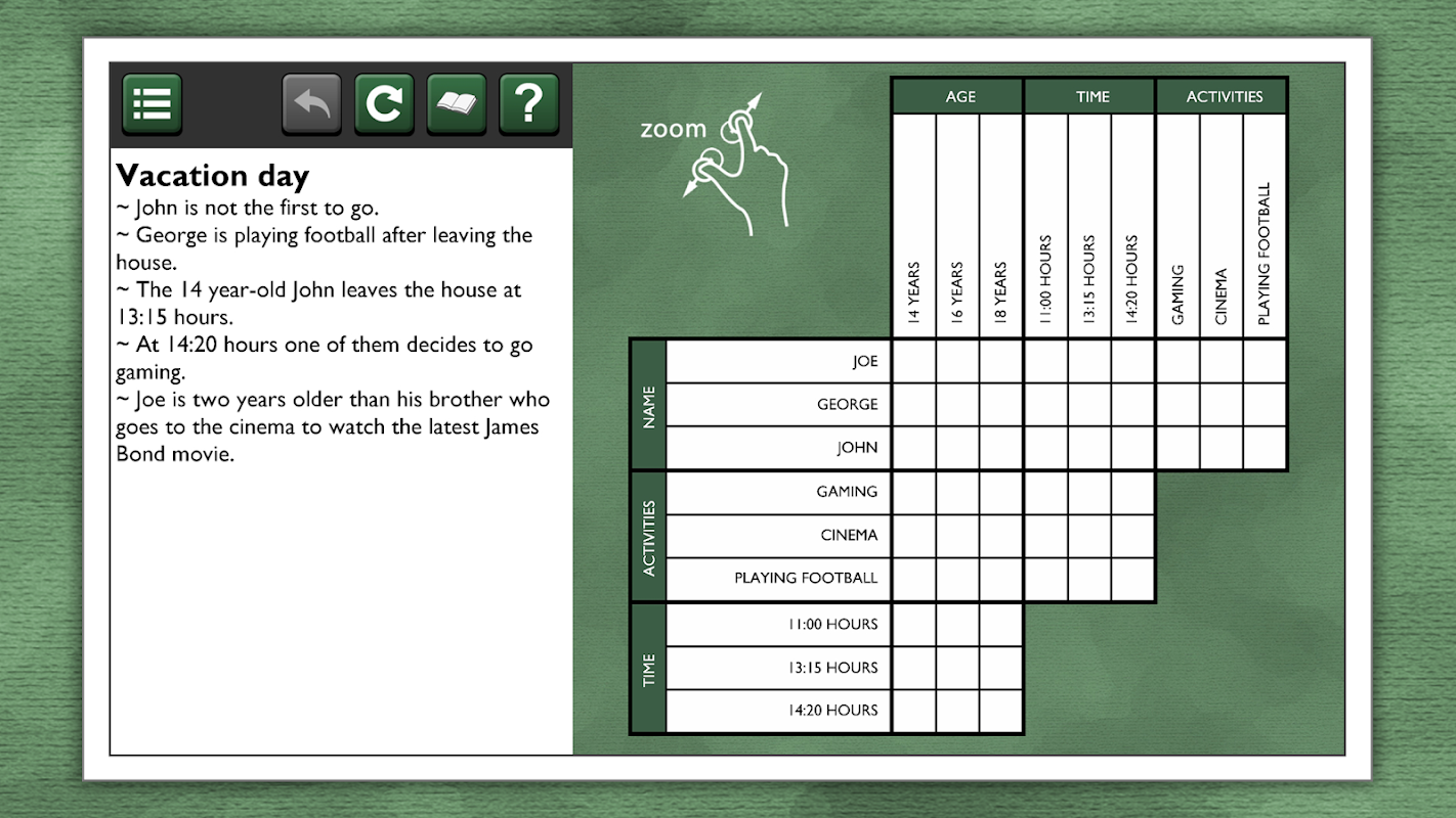 هذا التطبيق مُحسّن للهواتف والأجهزة اللوحية بدلًا من الورق، ويتمتع بالقدرة على مسح الأخطاء أو إظهار الحل عند التعثر. هذا يُسهّل ويسرع التركيز على اللغز المنطقي.