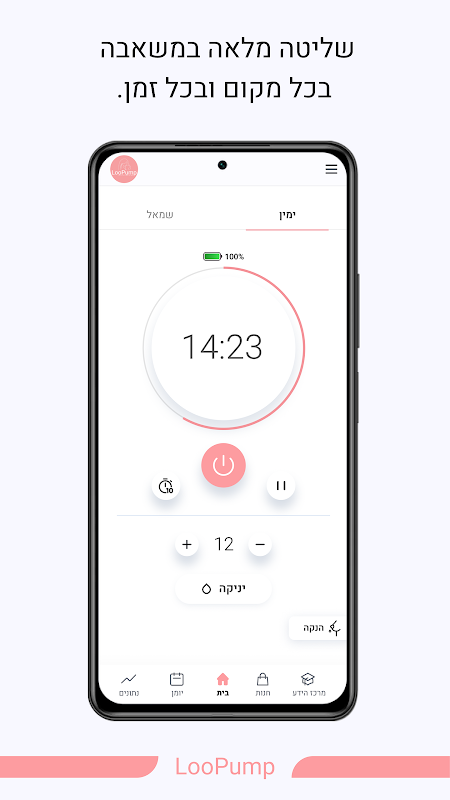 يتحكم تطبيق LooPump في المضخة المبتكرة من الطراز Ultra، ويتيح التشغيل بضغطة زر واحدة، في أي مكان وفي أي وقت (تشغيل المضخة وإيقافها، وتغيير أوضاع الضخ، وتنشيط المؤقت، وتغيير شدة الشفط ومراقبة الضخ). الوقت في الوقت الحقيقي). بالإضافة إلى ذلك، يوفر التطبيق دليل "الدعم الشخصي" المتوفر على مدار الساعة طوال أيام الأسبوع لضبط عملية الضخ بشكل فردي لكل أم، ويقدم نصائح لجعل عملية الضخ أسهل وأكثر كفاءة من أي وقت مضى. نحن نعلم أن الرحلة قد تكون شاقة.... فلنجعلها أسهل وأبسط!