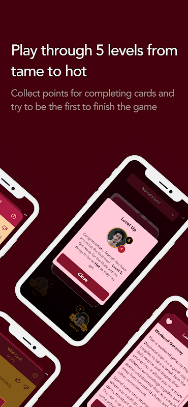 ابدأ بالترويض بالمستوى 1 واعمل في طريقك إلى المستوى الأكثر سخونة - المستوى 5. سوف ترتدي ملابس أقل ، وتجيب على الأسئلة الأكثر رقة ، وتستكمل مهامًا أكثر تعقيدًا أثناء تقدمك عبر المستويات. اجمع النقاط لاستكمال البطاقات ، وحاول التغلب على شريكك للفوز واختر بطاقة فانتازيا خاصة لإنهاء اللعبة.