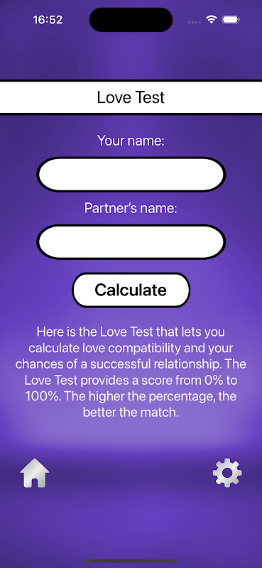 إخلاء المسؤولية: يرجى ملاحظة أن تطبيق اختبار الحب هذا تم تطويره لأغراض الترفيه فقط وليس المقصود منه إيذاء مشاعر أي مستخدم. يستخدم التطبيق خوارزمية رقمية لتحديد مدى تطابق الحب ويجب استخدامه للمتعة فقط.