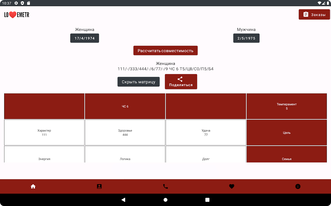 LoveMetr - سيساعدك تطبيق تحليل توافق تاريخ الميلاد على معرفة مدى توافقك مع شريك حالي أو محتمل. فقط أدخل تاريخي ميلاد وستحصل على النتيجة.