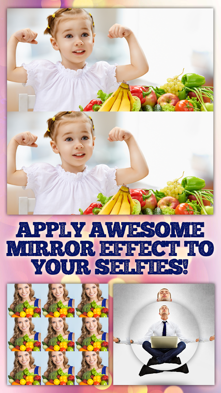⯮⯬ ضرب صور شخصية المفضلة لديك وخلق تأثير صورتين في واحدة! شارك صورتك المرآة بسهولة على الشبكات الاجتماعية ، واحفظها في معرض الصور الخاص بك أو قم بتعيينها كخلفية! سيلفي تأثير المرآة الخاص بك مظهرًا أثيريًا تمامًا ومستعدًا لتلقي الكثير من الإعجابات والتعليقات! التصوير الفوتوغرافي بتأثير المرآة هو أحد أكثر الطرق فعالية لإضفاء مظهر خارق على صورك. إنشاء صور متعددة وتكرار نفسك في صورة مع عدم وجود مهارات خاصة! يمكنك أيضًا تطبيق بعض المرشحات المذهلة أو إضافة نص إلى الصورة وبهذه الطريقة تجعل عملك أكثر وضوحًا. سيساعدك تطبيق صور الوجه هذا على تعديل صورك بسهولة ودون أي جهد ، لكن مع نتائج مذهلة!