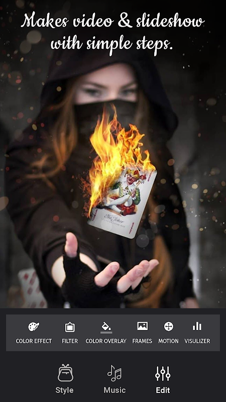 Magic.ly - Magic Effects Video Editor هو أحد أفضل تطبيقات إنشاء الفيديو من الصور الموجودة في مجموعتك مثل تطبيق Music Video master. لإنشاء مقاطع فيديو رائعة ، تحتاج إلى القيام ببعض الخطوات: اختيار الصور وإضافة الموسيقى واختيار السمات والإطارات.