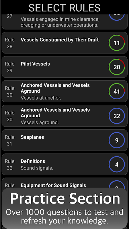 ابدأ بقسم التعلم لفهم القواعد خطوة بخطوة، ثم انتقل إلى قسم الممارسة لتعزيز معرفتك وتحسين أدائك. يغطي Master-Nav الجزء A إلى الجزء D من COLREGS (القواعد من 1 إلى 37) وإشارات الاستغاثة الموجودة في الملحق IV بدقة. مع أكثر من 1000 سؤال بتنسيقات مختلفة، كل منها مدعوم بإجابات رسومية واضحة تسلط الضوء على الأخطاء، يعزز Master-Nav معرفتك من خلال الممارسة المتكررة، مما يجعل الاحتفاظ بالقواعد أمرًا سهلاً.