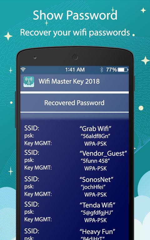 Recover all the passwords of wireless connected networks you have ever connected with the help of wifi key show 2018 a useful tool. We are quite often forget the password of our wifi network, no need to worry just use this wifi password recovery app to recover all the previous wifi passwords. It is the best tool to recover the ever lost password of your wifi network. You can enjoy free wifi if your modem has the default passwords, but this requires root permission. Never lose your wifi key again and use wifi as you like.