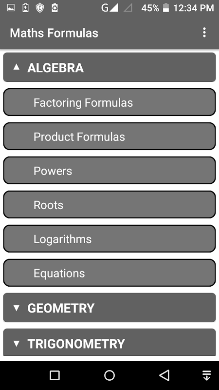 يحتوي هذا التطبيق على جميع الصيغ الأساسية للرياضيات.