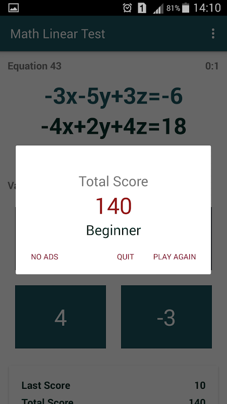اختبار الرياضيات الخطي هو لعبة رياضيات بسيطة تُقدّم لك عدة معادلات خطية. طريقة اللعب بسيطة، ما عليك سوى اختيار قيمة x أو y أو z المناسبة للمعادلة. النتيجة التي ستحصل عليها تُمثّل مدى معرفتك برياضيات المعادلات الخطية بمتغير مجهول واحد أو اثنين أو ثلاثة. هيا نجرب لعبتنا الرياضية، واستمتع!