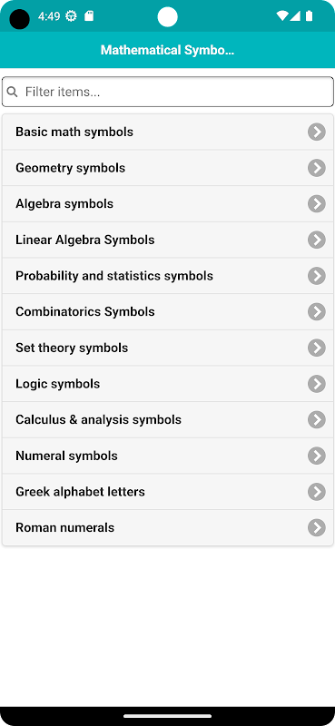 الرياضيات، الجبر، الهندسة، حساب التفاضل والتكامل، الأبجدية، الاحتمالات والإحصائيات رموز للطلاب. في هذا التطبيق، سوف تحصل على هذه المعلومات الرياضيات: