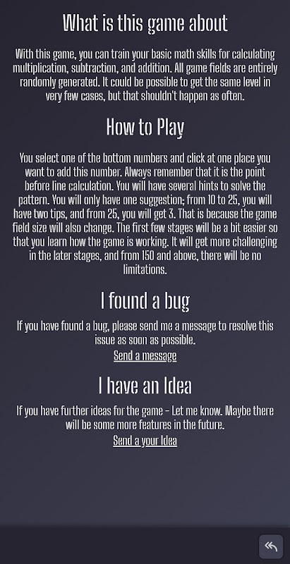مع هذه اللعبة، يمكنك تطوير مهاراتك الحسابية الأساسية لحساب الضرب والطرح والجمع. جميع حقول اللعبة مُولّدة عشوائيًا بالكامل. قد يكون من الممكن الوصول إلى نفس المستوى في حالات نادرة جدًا، ولكن هذا لا يُفترض أن يحدث كثيرًا.