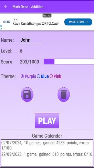يحتفظ MathRace بسجل يومي لألعابك، مما يتيح لك متابعة تقدمك وتتبع مدى ممارستك. إذا كنت أحد الوالدين، فهذه أداة مفيدة لتتبع تقدم طفلك. يدعم التطبيق ملفات تعريف/لاعبين متعددة، مما يسمح لأكثر من لاعب واحد بلعب اللعبة على نفس الجهاز.