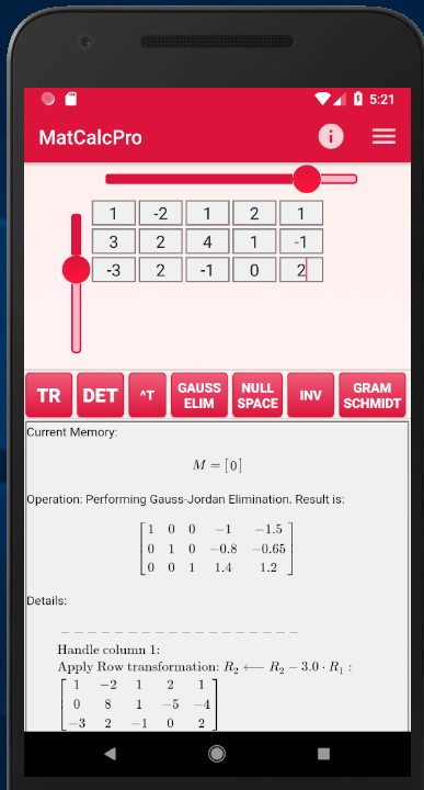 يمكنك تعيين أبعاد المصفوفة باستخدام أشرطة التمرير ، ثم يمكنك إدخال عناصر المصفوفة عن طريق الكتابة في كل خلية (تصبح الخلايا نشطة / غير نشطة بمجرد تحريك شريط التمرير المعني). يمكنك الانتقال إلى خلية أخرى إما بالضغط على مفتاح NEXT على لوحة المفاتيح الناعمة ، أو بالنقر على الخلية المطلوبة. ليس عليك إدخال قيم صفرية. فقط اترك الخلية المعنية فارغة.