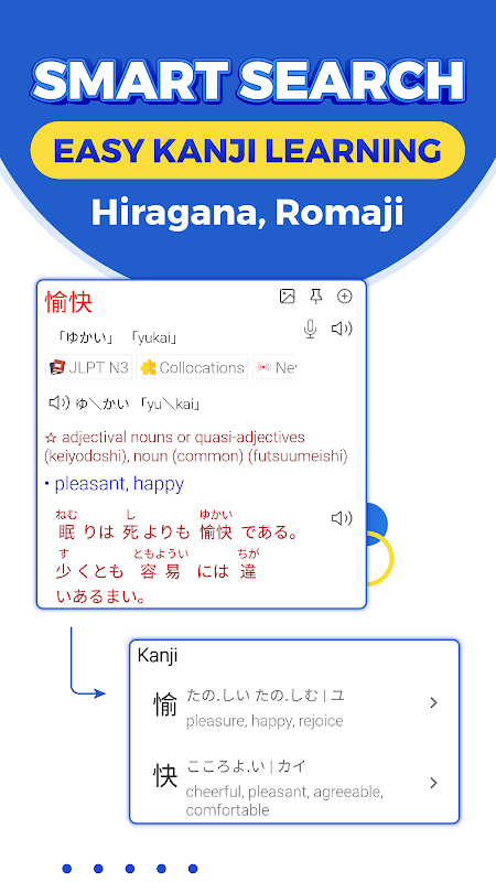 Japanese dictionary with diverse features, including detailed lookups, quick translations, and support for practice, making learning Japanese easier