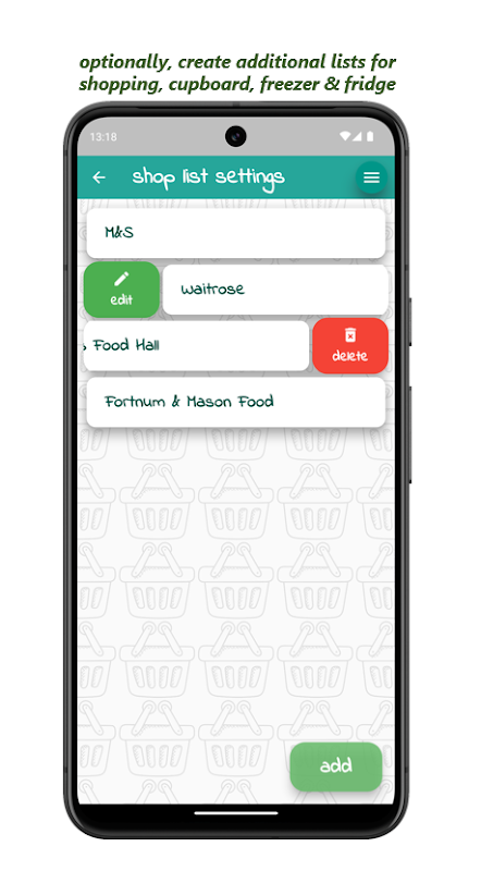 يمكن تحرير القوائم الإضافية عن طريق التمرير إلى اليمين أو حذفها عن طريق التمرير إلى اليسار ، ويمكنك تحديد الفئة المطلوبة (قائمة التسوق أو الخزانة أو الثلاجة أو الفريزر) من درج النهاية.